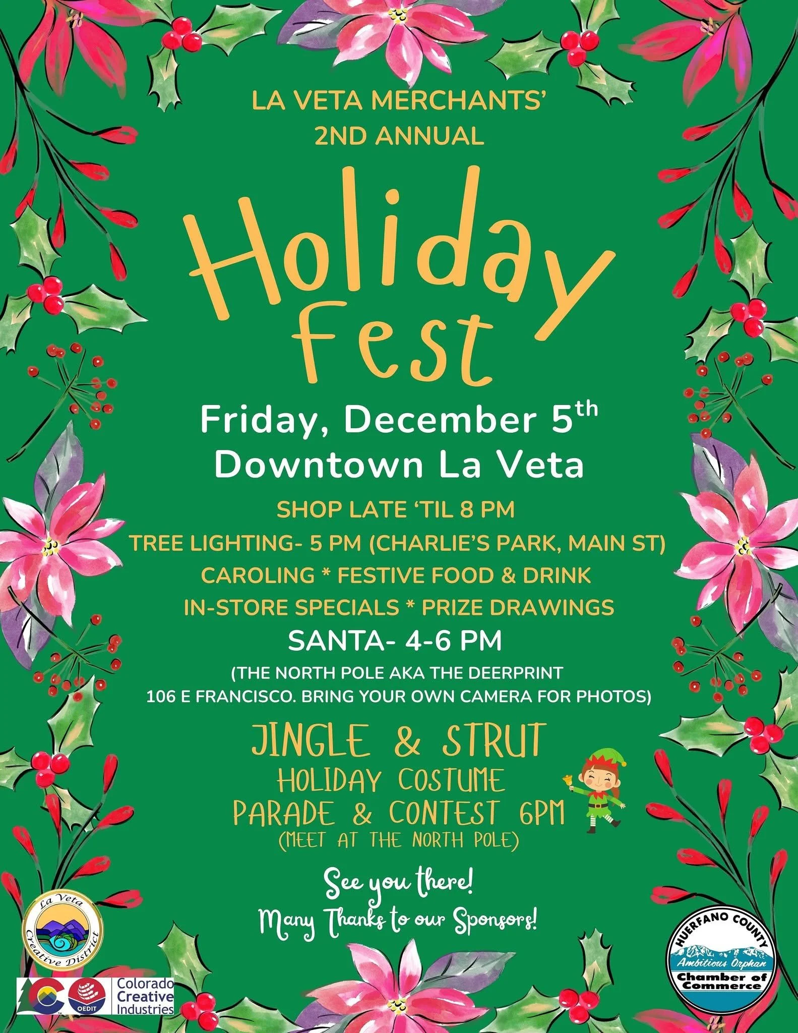 Warm up by our outdoor fire pit and enjoy a complimentary peppermint hot chocolate or caramel apple cider while you explore La Veta’s Holiday Fest happenings.