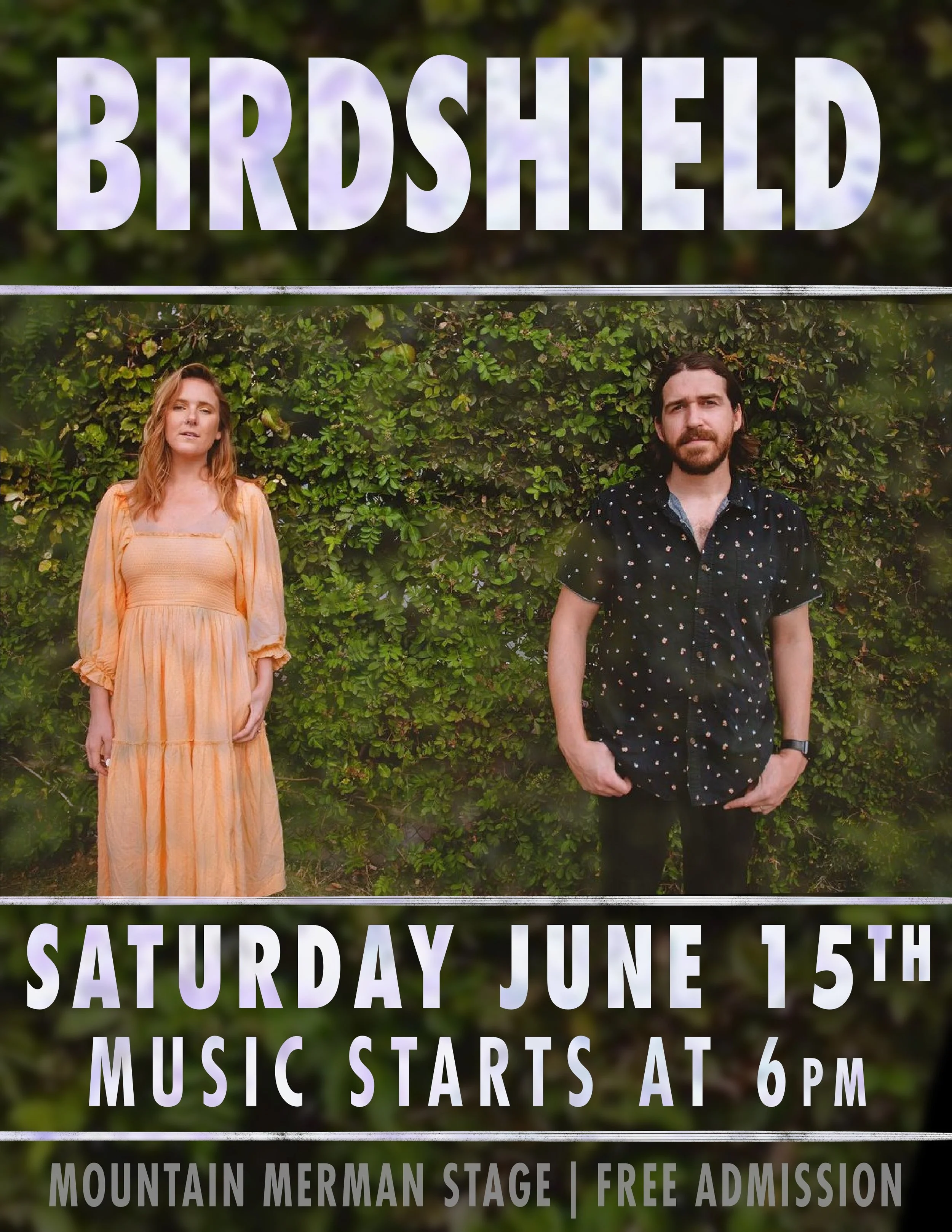 Back to All Events Live Music: Birdshield Saturday, June 15, 2024 6:00 PM 8:30 PM Google Calendar ICS Featuring: BIRDSHIELDLocal husband and wife duo, Jake and Anna, will be performing their catchy originals and fan-fave covers on the Merman Patio from 6-8:30pm. Cold beer and delicious, hand-crafted cocktails will be flowing!
